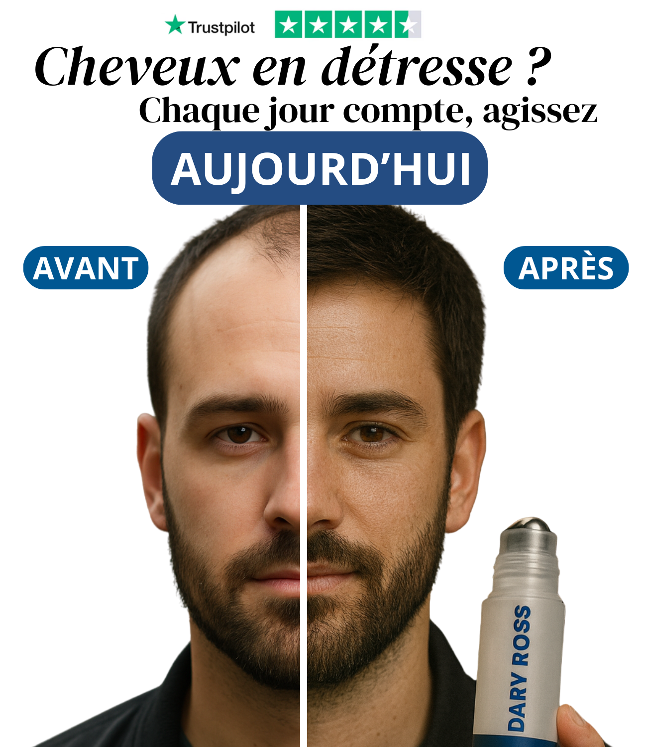 Mon coiffeur m'a signalé une perte de cheveux au niveau du crâne. J'ai paniqué. Un ami m'a parlé de Dary Ross et je suis content de l'avoir écouté : après quatre semaines, je vois une repousse là où je pensais que c'était fini.